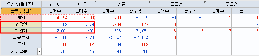 국내 시장은 역시 개인투자자들의 매수가 강화되면 메이저들의 반대포지션으로 인해 약세를 보인다는 사실을 그대로 보여주고 있음.