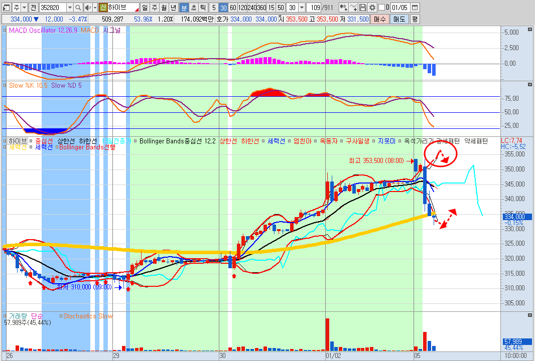 오늘 지난 주말 매도했던 하이브를 8% 매수한 상황으로 이 역시 추가 하락시 매수할 계획임.