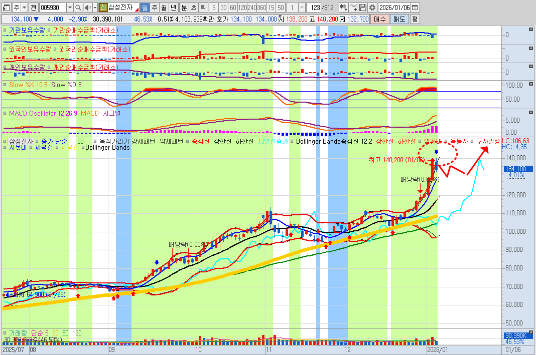 삼성전자는 일단 절반 매도한 상황으로 이후 충분한 조정이 이 이루어진 후 재매수로 대응하는 전략.