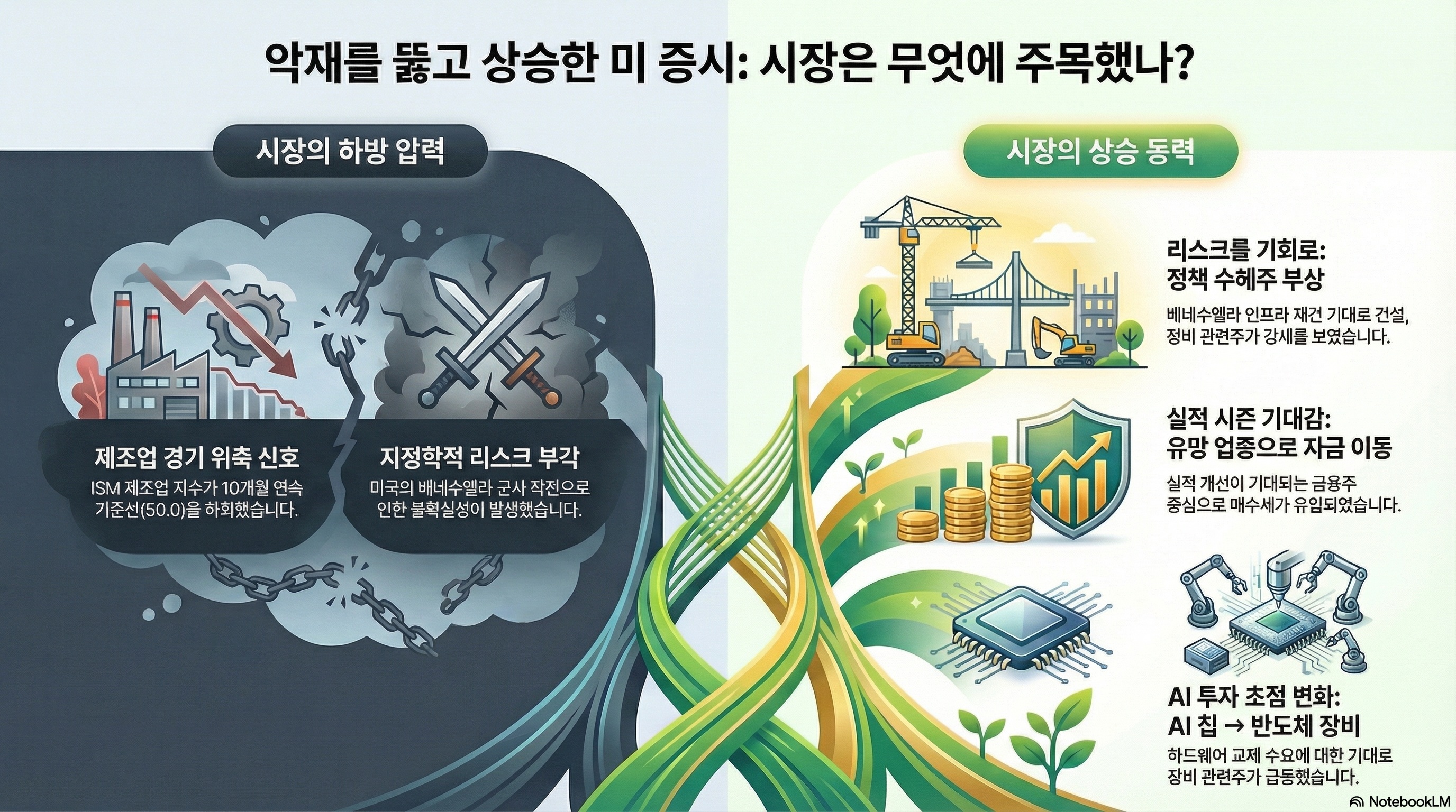 한편, 미국의 베네수엘라 군사 작전으로 공급 충격이 아닌 인프라 재건이라는 새로운 기회로 해석하며 관련주의 강세가 시장에 영향. 특히 트럼프가 미국 기업들이 베네수엘라 석유 산업 재건에 강력히 관여할 것이라고 발표하자 건설, 장비, 정제 기업들의 실질적인 수주 잔고 증가로 해석. 이로 인해 직접적인 수혜를 입는 기업들이 급등. 이는 지정학적 이슈가 발생했을 때 부정적인 요인보다 수혜주를 찾는 등 투자 심리가 여전히 견고하고 그동안의 학습 효과에 따른 것으로 추정