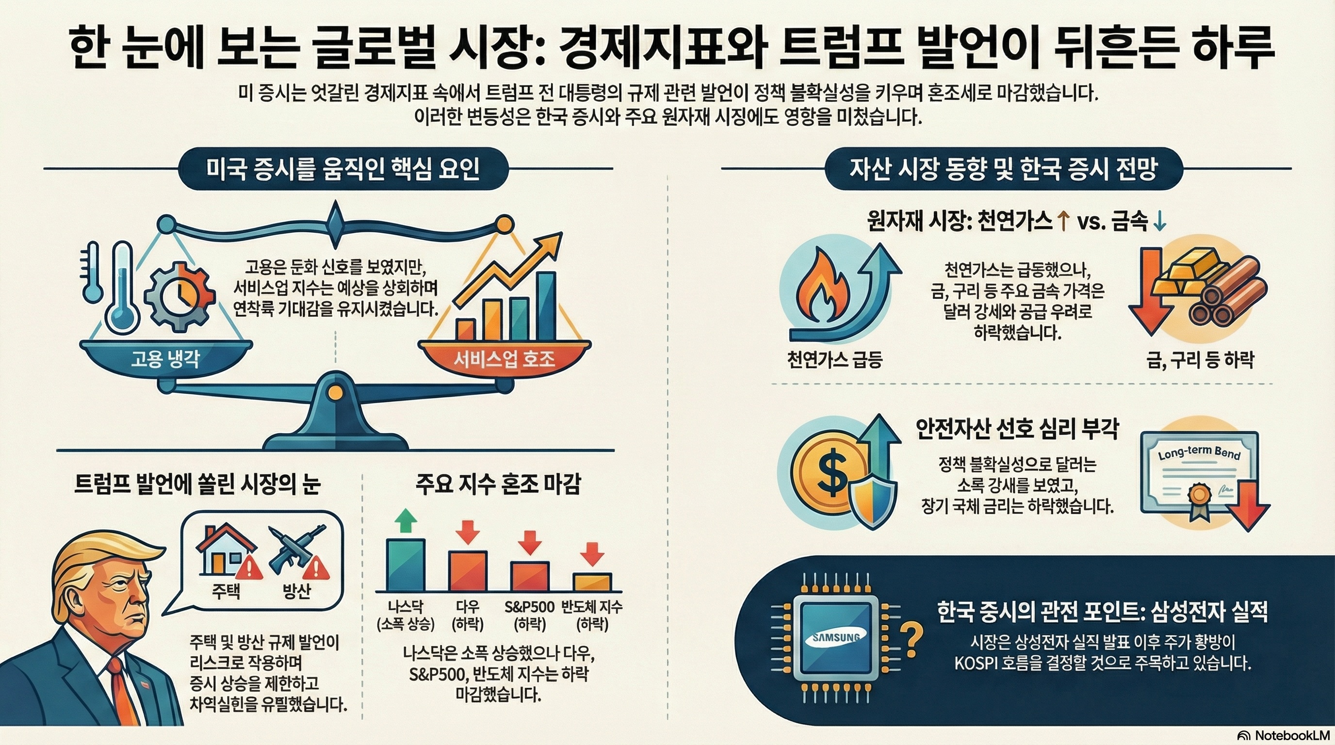 미 증시는 고용과 서비스업지수 등 경제지표를 소화하며 보합권으로 출발. 이후 최근 상승이 컸던 다우는 금융업종 중심으로 하락. 나스닥은 최근 강세를 보인 반도체가 위축됐지만 소프트웨어와 제약주의 강세로 상승하는 차별화가 진행. 그러나 장 후반 트럼프의 기관투자자 단독주택 매입 금지, 방산 기업 주주 환원 제한 발언이 규제 리스크로 확대되며 상승 축소 및 낙폭 확대(다우 -0.94%, 나스닥 +0.16%, S&P500 -0.34%, 러셀2000 -0.29%, 필라델피아 반도체 지수 -0.99%)