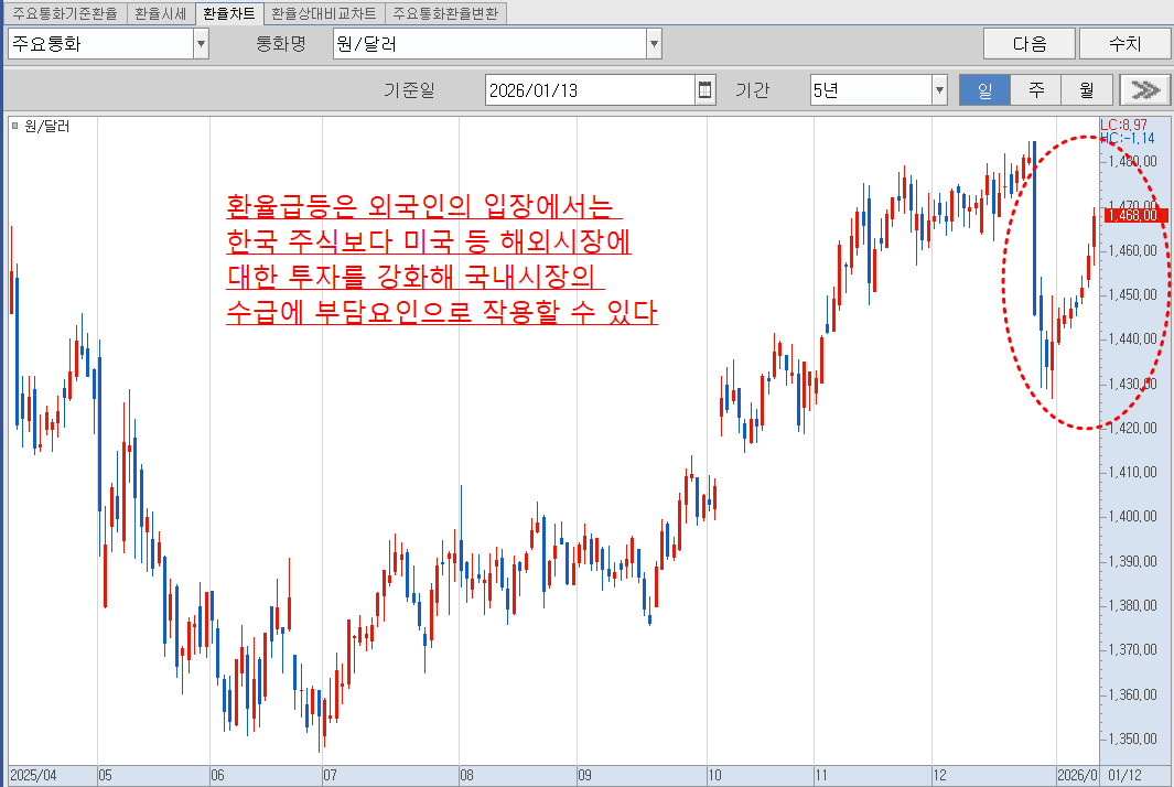 원달러 환율은 지난 당국개입에 의한 급락 후 곧바로 수직상승하면서 1,468원까지 솟아 오름. 이로 인해 외국인들의 매수도 소극적으로 변하는 양상.
