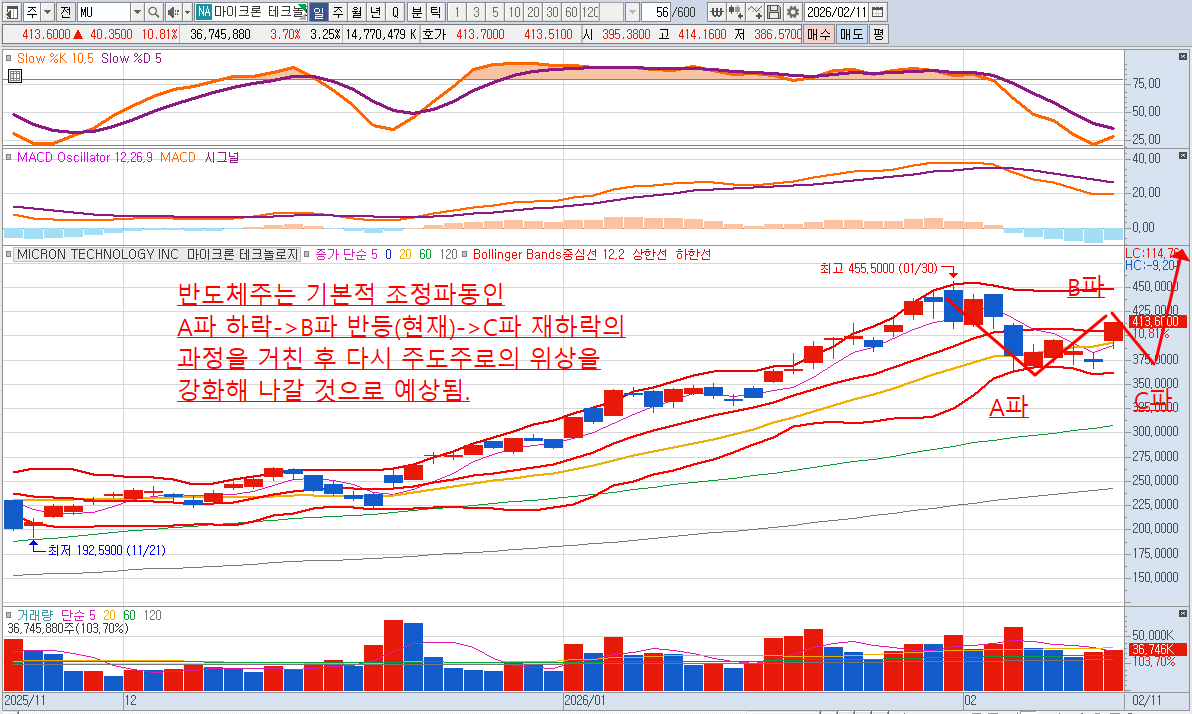 오늘 미국시장은 최근 조정을 거쳐 온 반도체주 중심으로 강세가 이루어짐. 마이크론(+9.94%), 샌디스크(+10.65%)를 비롯해 인텔 등이 강세. 램리서치 등 반도체 설비재료주들까지 강세는 보임. 반도체주의 이러한 모습은 최근 조정에 진입하면서 A파 하락에 따른 B파 반등의 성격이 강하며, 반등 후 다시 C파동의 재반락도 따를 것으로 예상됨. 하지만 이러한 조정파동을 마무리한 후 다시 주도주로써의 위상을 강화해 나갈 것으로 보임.
