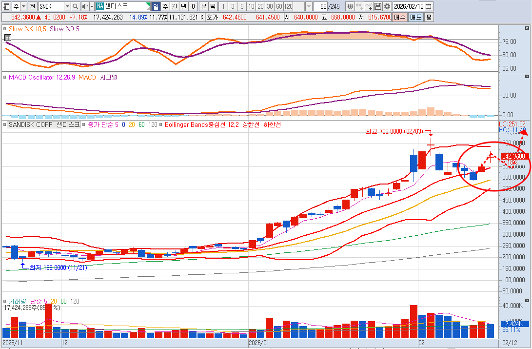 결국 시장의 글로벌 주도주는 반도체주라는 사실은 불변이며, 휴식을 취한 SK하이닉스, 샌디스크, 마이크론 등이 매력적으로 보임.