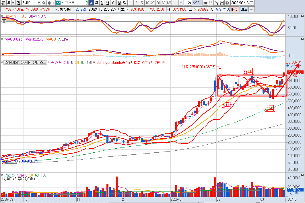 가장 중요한 것은 마이크론과 샌디스크의 신고가이며, 이것이 전쟁의 와중에서 실현되고 있다는 소실이 놀라운 상황임. 미국 반도체주의 상승에 자극 받아 삼성전자, SK하이닉스 역시 점차 상승압박을 받을 것으로 보임. 특시 삼성전자는 엔비디아의 새로운 AI 추론칩 그록3 LPU칩을 올 3분기에 삼성전자 파운드리에 맡기기로해 삼성전자는 메모리에 이어 비메모리까지 최고의 상황을 맞게 됨에 따라 25~30만으로 향한 움직임이 예상됨.