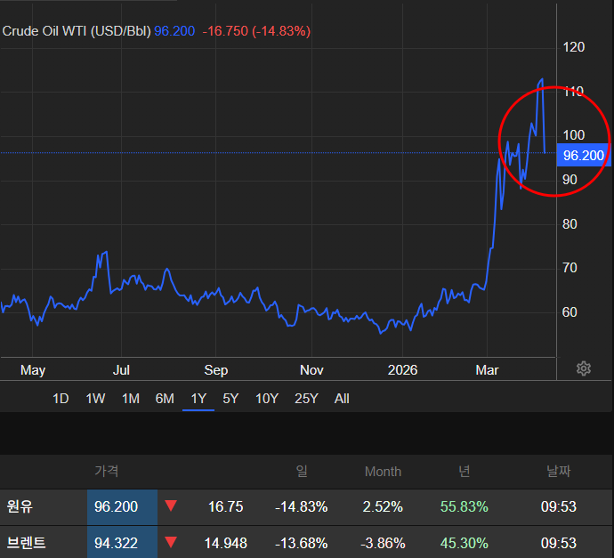 향후 중재를 통해 종전상황으로 이어질 수도 있다는 기대감으로 유가가 100$ 이하로 급락하는 모습. 휴전안에 호르무즈해협 개방이 들어 있다는 점에서 유조선의 자유로운 이동이 이루어진다면 석유공급망 복귀로 인한 유가안정과 물가안정 기대감이 어울어지면서 시장은 긍정적으로 반응할 수밖에 없을 것임.