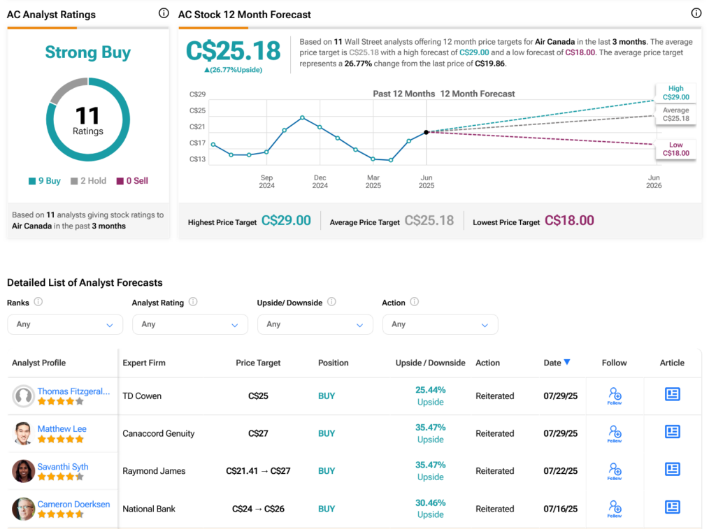 월가는 에어캐나다(TSE:AC) 주식에 대해 강력 매수 의견을 제시하고 있다. 최근 3개월간 9개의 매수와 2개의 보유 의견이 나왔다. 지난 1년간 25.16% 상승한 후, 현재 에어캐나다의 평균 목표주가는 주당 25.18캐나다달러로 26.77%의 추가 상승 여력이 있는 것으로 분석된다.