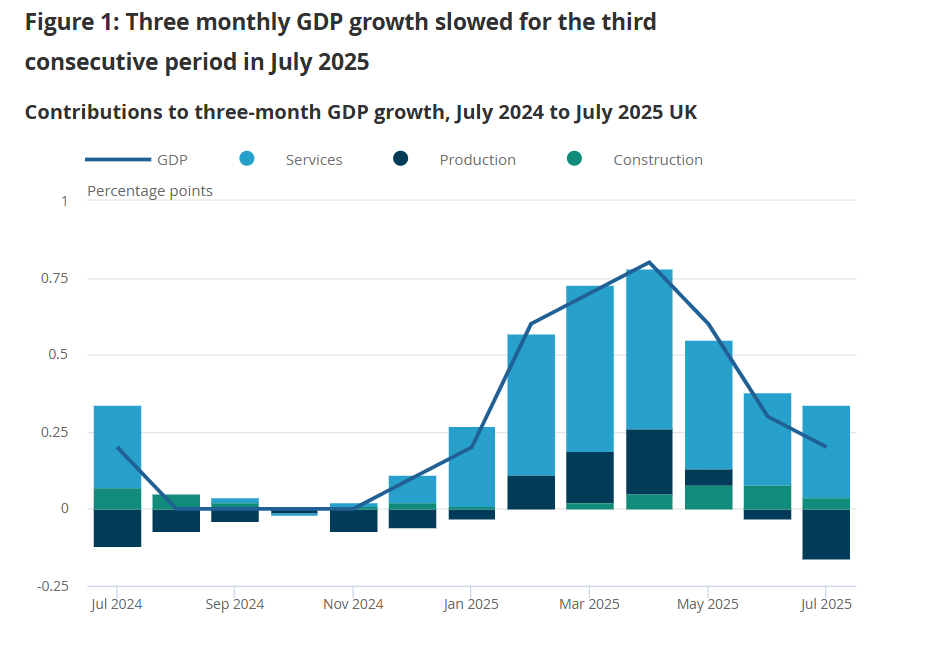 영국 통계청은 금요일 6월 0.4% 성장했던 영국의 GDP가 7월에는 성장이 멈췄다고 발표했다. 산업생산과 제조업 생산은 각각 0.9%, 1.3% 감소해 7월 전망치를 하회했다.