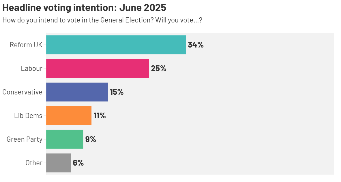 현재 총선이 실시된다면 우파 성향의 리폼UK당이 승리할 것으로 전망된다. 6월 입소스 여론조사에서 리폼UK당 지지율은 34%를 기록한 반면, 노동당은 25%에 그쳤다.