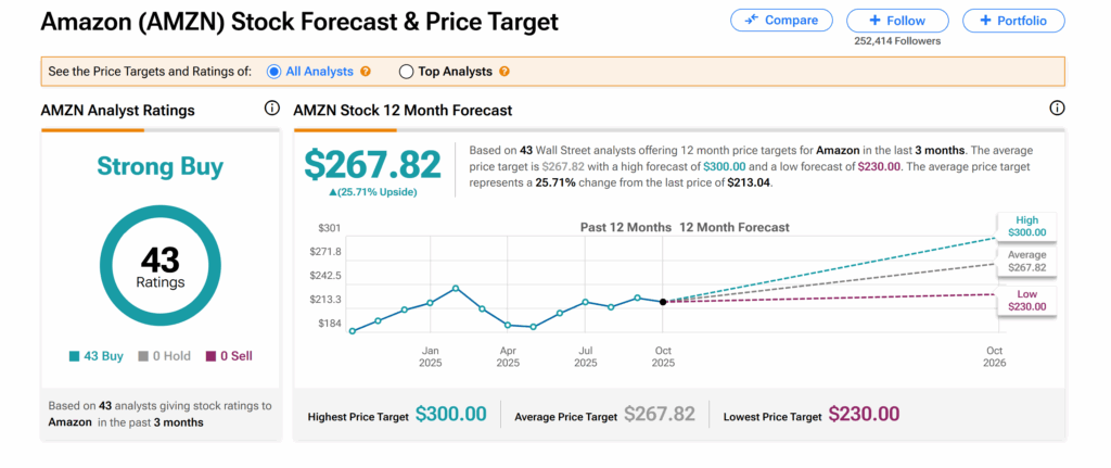 팁랭크스에 따르면 이는 지난 3개월간 애널리스트들이 내린 43개의 매수 의견을 바탕으로 한 것이다. 또한 아마존 평균 목표주가 267.82달러는 현재 수준에서 약 26%의 상승 여력을 시사한다.