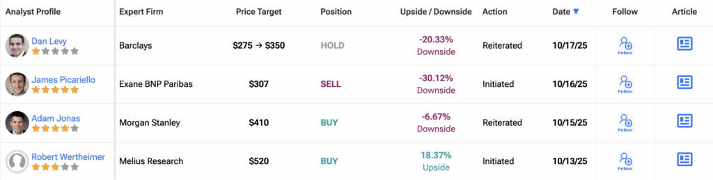 현재 월가는 16개 매수, 13개 보유, 10개 매도 추천을 바탕으로 테슬라 주식에 대해 보유 컨센서스 등급을 매기고 있다. 12개월 TSLA 주가 목표 평균 366.35달러는 현재 수준에서 16.6% 하락을 의미한다.