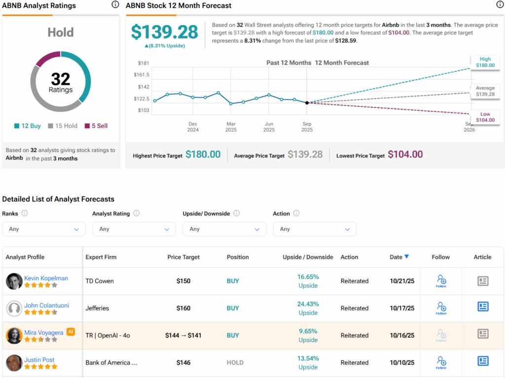 월가에서 애널리스트들은 ABNB 주식에 대해 보유 의견을 제시하고 있다. 지난 3개월간 매수 12건, 보유 15건, 매도 5건의 의견이 나왔다. 또한 ABNB의 평균 목표주가는 주당 139.28달러로 8.3%의 상승 여력을 시사한다.