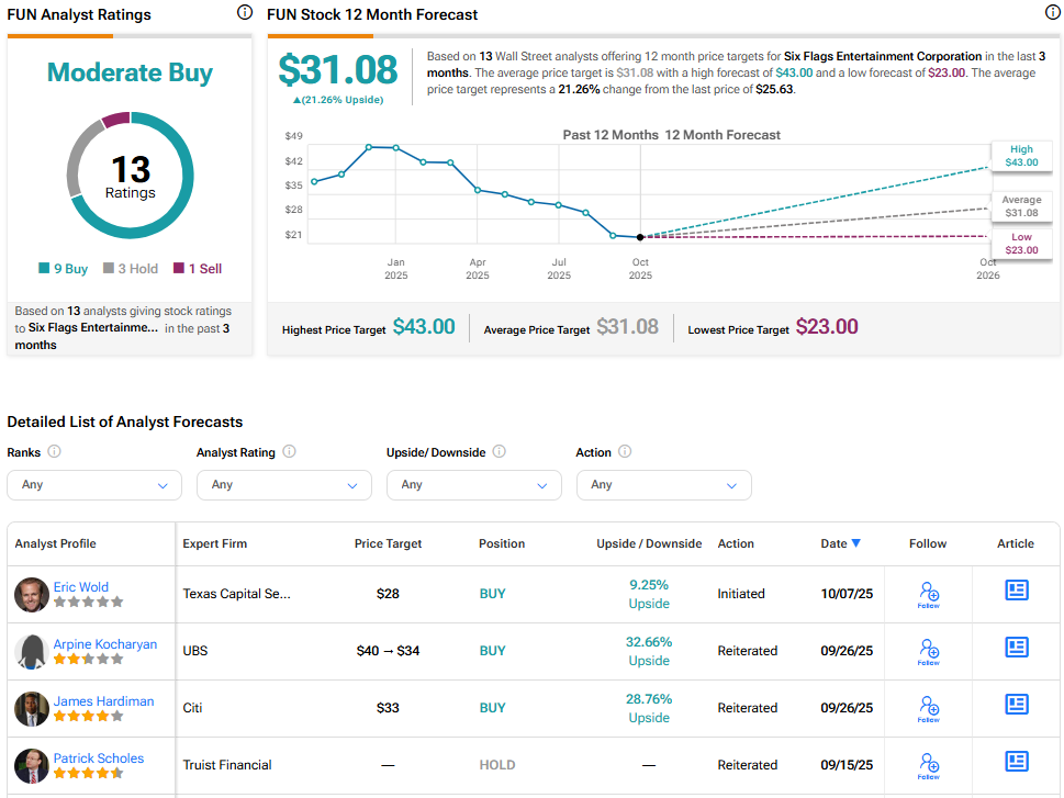 식스 플래그스 엔터테인먼트는 증권가 애널리스트들 사이에서 비교적 긍정적인 전망을 받고 있으며, 보통 매수 컨센서스 등급을 기록하고 있다. FUN 주식의 평균 목표주가는 31.08달러로, 현재 가격 대비 21.26% 상승 여력을 시사한다.