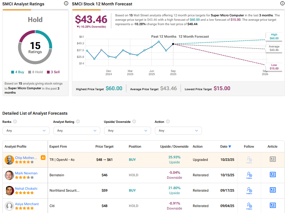 팁랭크스에서 SMCI 주식은 지난 3개월간 매수 4건, 보유 8건, 매도 3건을 기록하며 보유 컨센서스 등급을 받았다. 한편 슈퍼 마이크로 컴퓨터의 평균 목표주가는 43.46달러로 현재 수준 대비 10.28% 하락 여력을 시사한다.