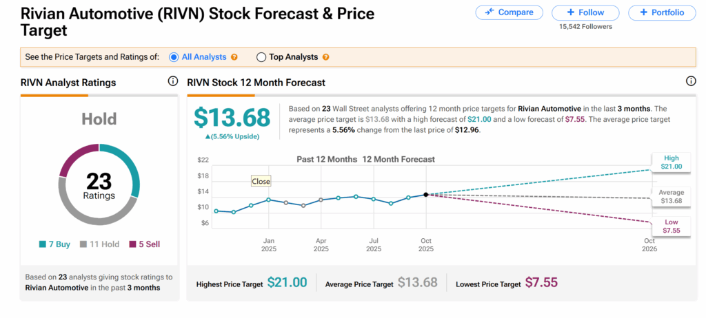 월가로 눈을 돌리면, 팁랭크스에 따르면 리비안 주식은 현재 보유 등급을 받고 있다. 이는 지난 3개월 동안 23명의 월가 애널리스트들이 제시한 7건의 매수, 11건의 보유, 5건의 매도 의견을 기반으로 한 것이다.