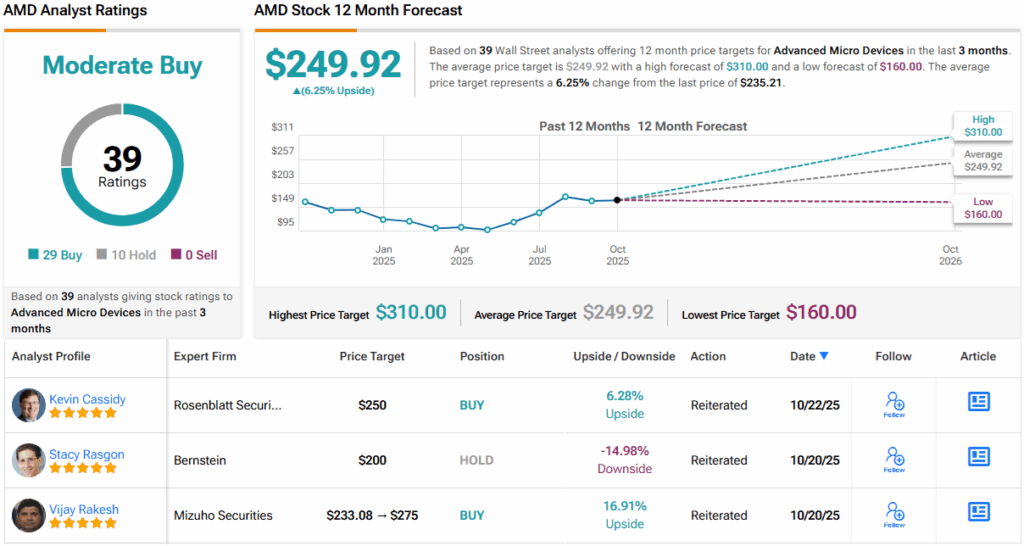 이러한 논평은 AMD 주식에 대한 애널리스트의 매수 등급을 뒷받침하지만, 그의 250달러 목표주가는 6%의 소폭 상승 여력을 시사하며, 이는 급격한 단기 상승 기대보다는 AMD의 실행력에 대한 신뢰를 반영한다. (캐시디의 실적 기록을 보려면 여기를 클릭)