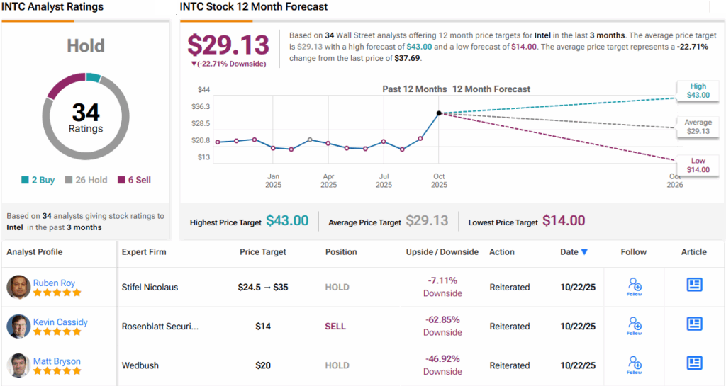 전반적으로 인텔 주식은 애널리스트 컨센서스로부터 보유(즉, 중립) 등급을 받고 있으며, 이는 매수 2건, 보유 26건, 매도 6건으로 구성된 최근 34건의 애널리스트 리뷰를 기반으로 한다. 주가는 현재 37.72달러에 거래되고 있으며, 평균 목표주가 29.13달러는 1년 하락 여력 23%를 시사한다. (INTC 주가 전망 참조)