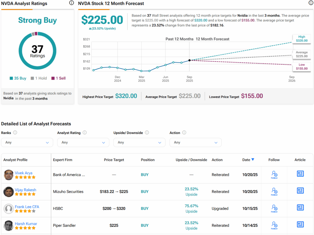 월가로 눈을 돌리면, 애널리스트들은 NVDA 주식에 대해 강력 매수 컨센서스 등급을 부여하고 있다. 지난 3개월간 매수 35건, 보유 1건, 매도 1건이 제시됐다. 또한 NVDA의 평균 목표주가는 주당 225달러로, 23.5%의 상승 여력을 시사한다.