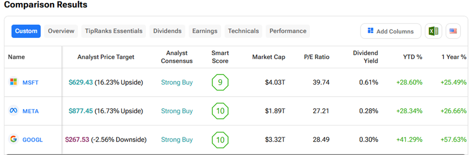 월가는 세 주식 모두에 "적극 매수" 등급을 부여했으며, META가 향후 12개월 동안 가장 높은 상승 잠재력을 제공한다.