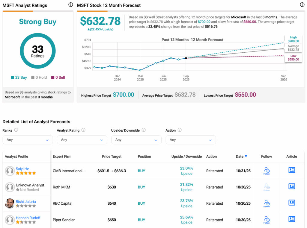 월가에서 증권가는 아래 그래픽에 표시된 바와 같이 지난 3개월 동안 33건의 매수 의견을 바탕으로 MSFT 주식에 대해 강력 매수 컨센서스 등급을 부여했다. 지난 1년 동안 28.12%의 주가 상승 이후, 주당 632.78달러의 평균 MSFT 목표주가는 22.45%의 상승 여력을 시사한다.