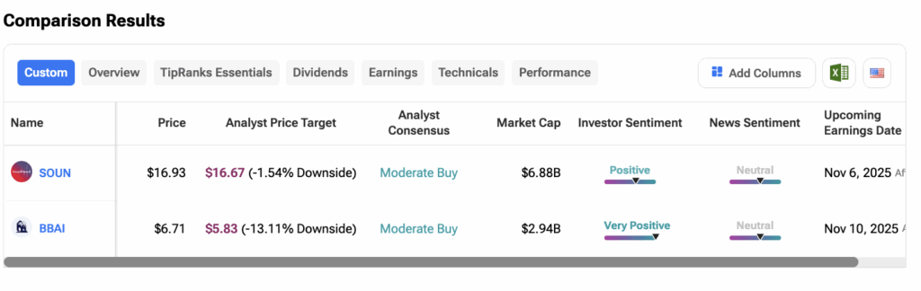 팁랭크스의 주식 비교 도구를 사용해 SOUN과 BBAI를 비교한 결과, 증권가가 어떤 소형 AI 주식을 선호하는지 확인할 수 있었다. 두 주식 모두 보통 매수 등급을 받았다. SOUN 주식의 목표가는 16.67달러로 1.5%의 하락 여력을 시사하는 반면, BBAI의 목표가는 5.83달러로 13% 이상의 더 큰 하락 여력을 내포하고 있다.