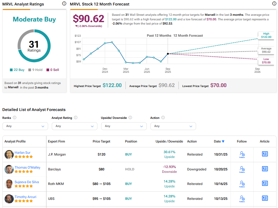 현재 월가는 마벨 주식에 대해 22건의 매수와 9건의 보유 의견을 바탕으로 보통 매수 컨센서스 등급을 부여하고 있다. 마벨 주가 목표가 평균은 90.62달러로 현재 수준에서 2.06%의 하락 여력을 시사한다.