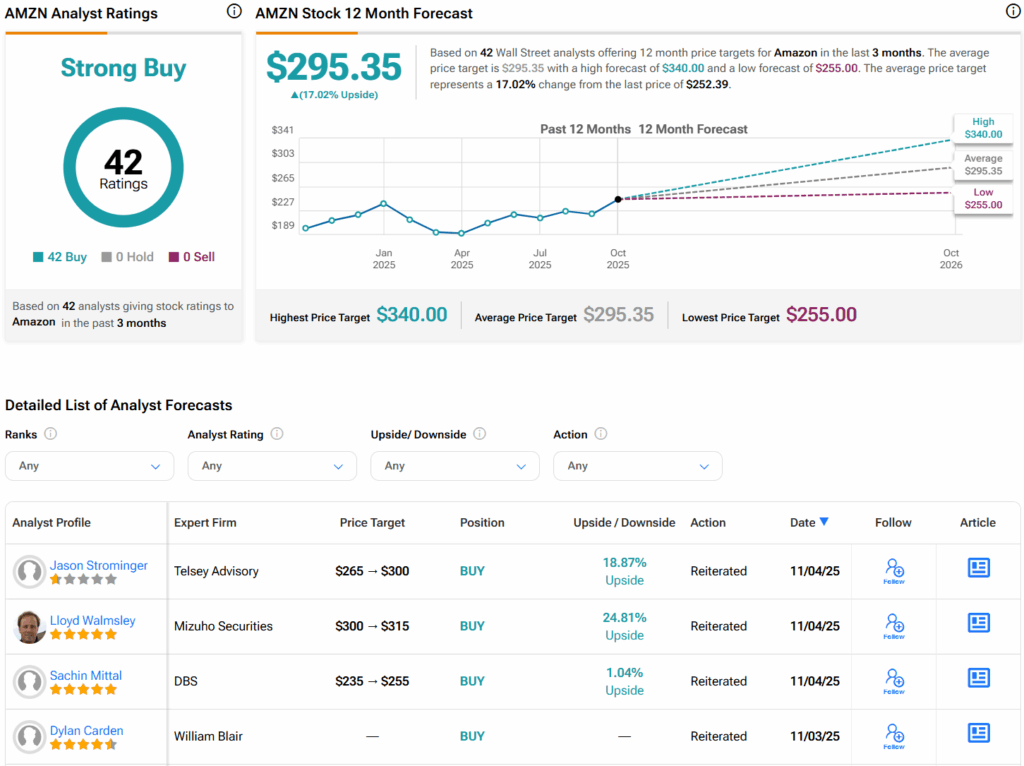 월가 증권가는 아마존 주식에 대해 강력 매수 의견을 제시하고 있다. 아래 그래픽에서 볼 수 있듯이 지난 3개월간 42건의 매수 의견이 나왔다. 또한 아마존 주식의 평균 목표주가는 주당 295.35달러로 17%의 상승 여력을 시사한다.