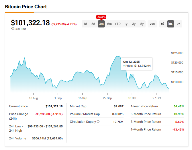 11월 4일 오후 거래에서 비트코인은 디지털 토큰당 99,966달러까지 하락했으며, 지난 24시간 동안 약 6% 하락했다. 다른 암호화폐들은 더욱 부진한 모습을 보이고 있으며, 시가총액 2위 암호화폐인 이더리움 (ETH)은 거의 10% 하락하여 3,296달러까지 떨어졌다.