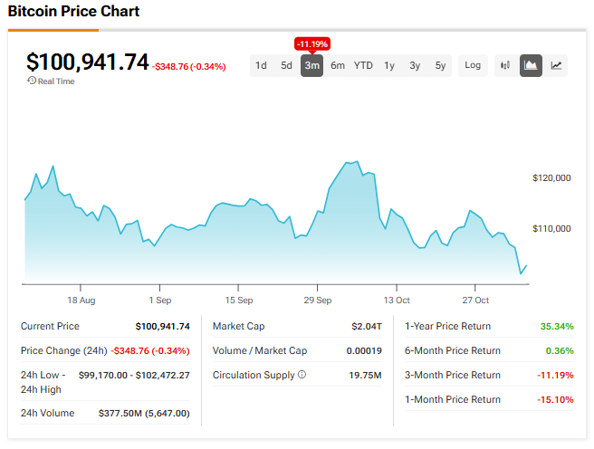 스트래티지는 특히 비트코인 가격 하락으로 큰 타격을 받았다. 비트코인은 10월 초 사상 최고치인 126,000달러를 넘긴 후 100,000달러까지 떨어졌다. BTC는 최근 디지털 자산 약세 속에서 올해 6월 이후 처음으로 주요 지지선인 100,000달러 아래로 하락했다.