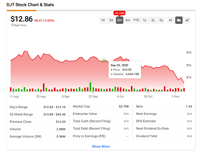 트럼프 미디어 앤 테크놀로지 그룹(DJT) 주식이 3분기 예상보다 큰 재무 손실을 보고한 후 3% 하락했다.
