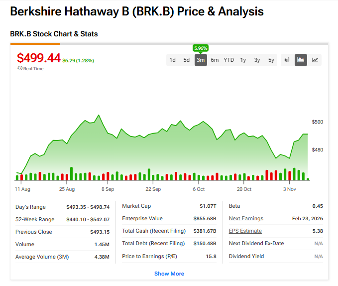 현재 버크셔 해서웨이의 보다 저렴한 클래스 B 주식에 대해 등급과 목표가를 제시하는 증권가는 소수에 불과하다. 따라서 대신 주식의 3개월 실적을 살펴보겠다. 아래 차트에서 볼 수 있듯이 BRK.B 주가는 지난 12주 동안 6% 상승했다.