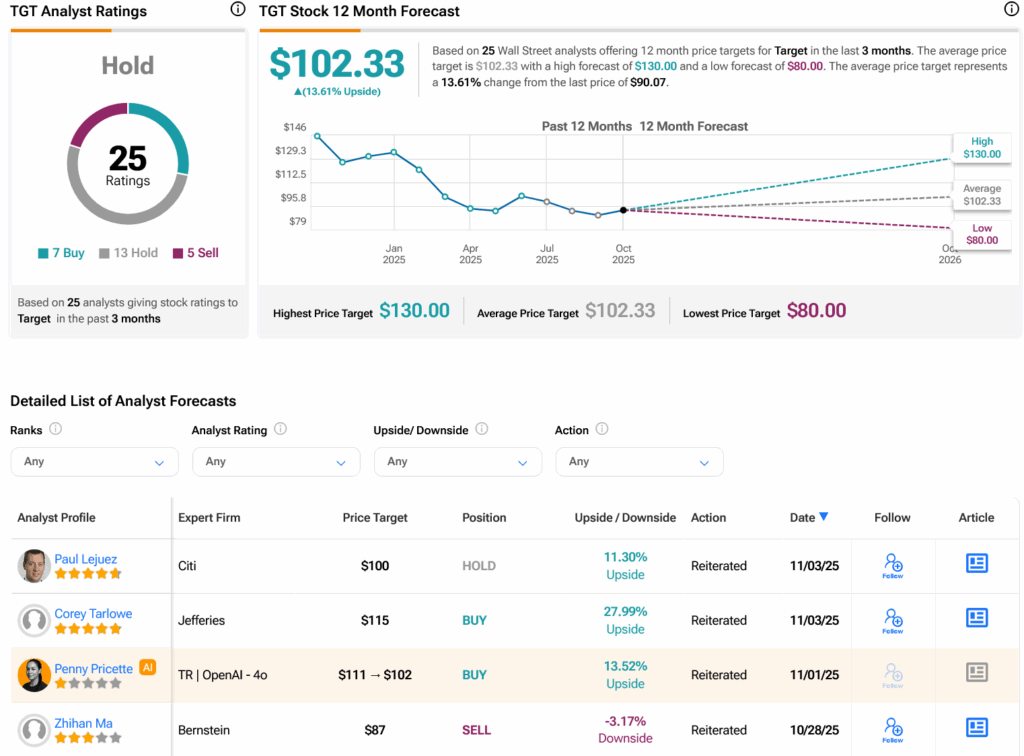 월가를 보면, 애널리스트들은 지난 3개월간 매수 7건, 보유 13건, 매도 5건을 기록하며 TGT 주식에 대해 보유 컨센서스 등급을 부여했다. 지난 1년간 주가가 40.48% 하락한 후, 주당 평균 TGT 목표주가 102.33달러는 13.61%의 상승 여력을 시사한다.