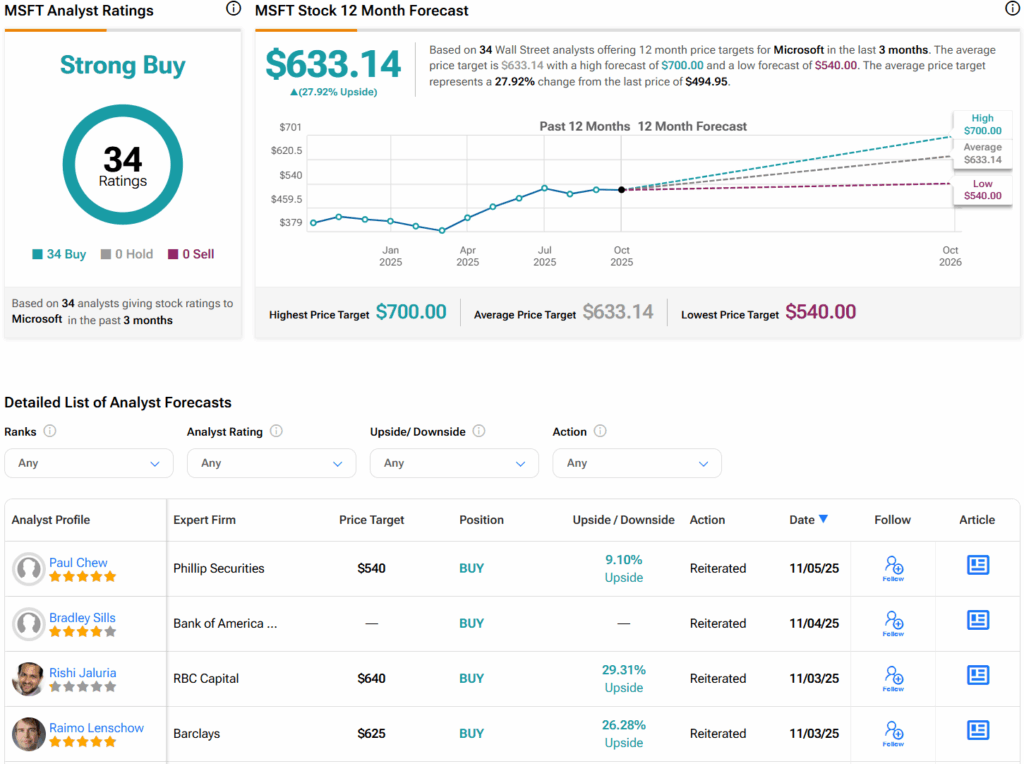 증권가에서는 지난 3개월간 34건의 매수 의견을 바탕으로 MSFT 주식에 대해 강력 매수 컨센서스 등급을 부여하고 있다. 또한 MSFT의 평균 목표주가는 주당 633.14달러로 28%의 상승 여력을 시사한다.