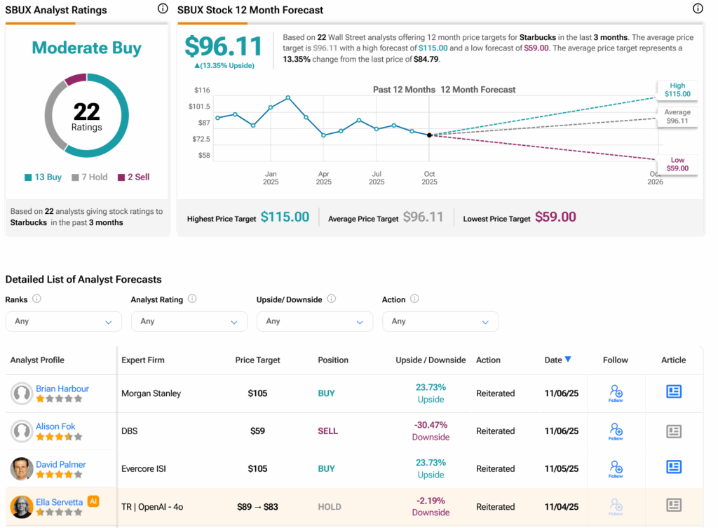 월가에서 애널리스트들은 지난 3개월간 매수 13건, 보유 7건, 매도 2건을 기록하며 SBUX 주식에 대해 보통 매수 의견을 제시하고 있다. 지난 1년간 주가가 15.72% 하락한 후, SBUX의 평균 목표주가는 주당 96.11달러로 13.35%의 상승 여력을 시사한다.