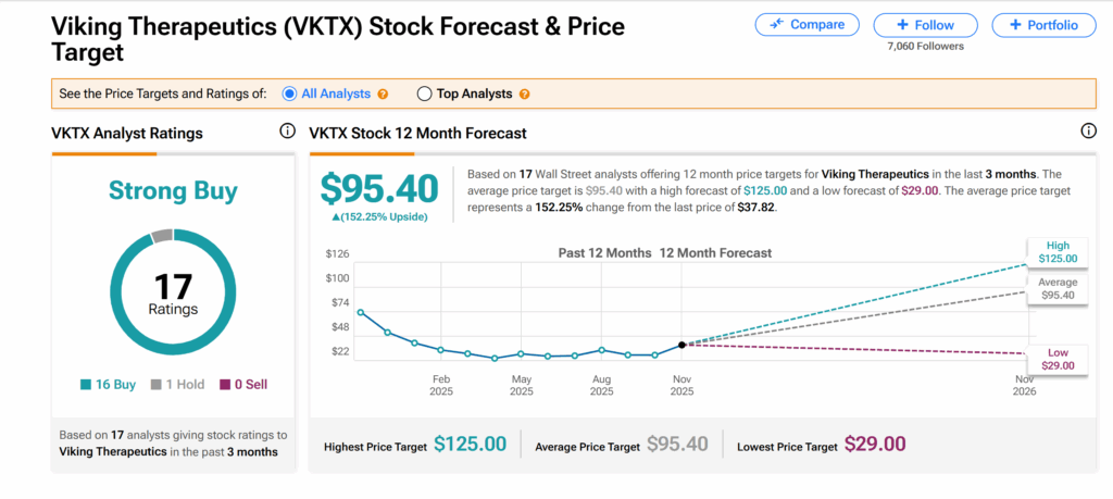 이는 지난 3개월간 애널리스트들이 제시한 16건의 매수와 1건의 보유 의견을 기반으로 한다. 또한 95.40달러의 평균 VKTX 목표주가는 현재 수준에서 152%의 대규모 성장 잠재력을 시사한다.