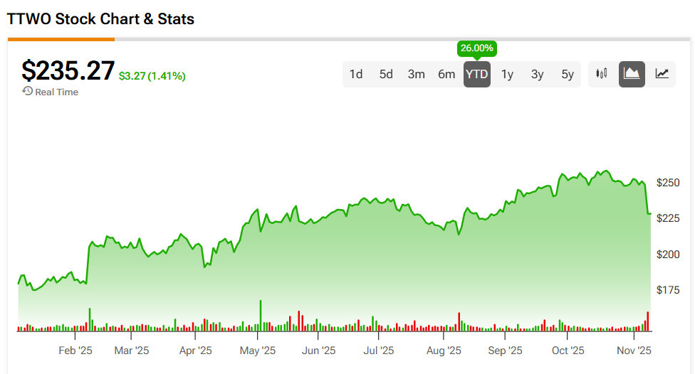 테이크투 주식은 월요일 1.41% 상승했다. 연초 대비 26% 상승세를 이어갔다. 주가는 지난 12개월 동안 29.33% 상승했다.
