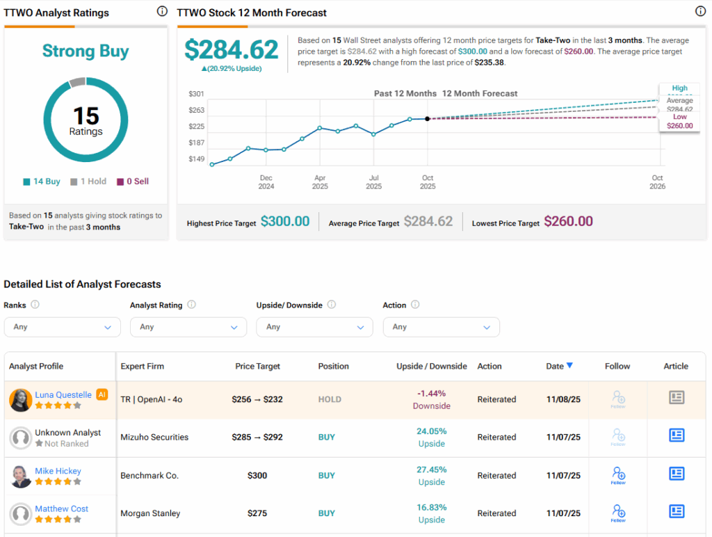 월가로 눈을 돌리면, 증권가의 테이크투에 대한 컨센서스 등급은 적극 매수다. 지난 3개월 동안 14건의 매수 의견과 1건의 매도 의견이 나왔다. 이와 함께 TTWO 주식의 평균 목표주가는 284.62달러로, 주가의 잠재적 상승 여력은 20.92%다.