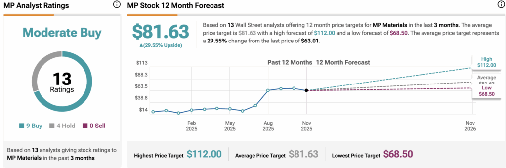 커버리지는 여전히 우호적이다. 팁랭크스의 애널리스트 데이터는 주식의 다음 상승 구간에 대해 온건한 강세 전망을 그린다. 13명의 월가 애널리스트를 기반으로 MP는 지난 3개월간 9개의 매수 등급과 4개의 보유 등급으로 온건한 매수 컨센서스를 유지하고 있다.