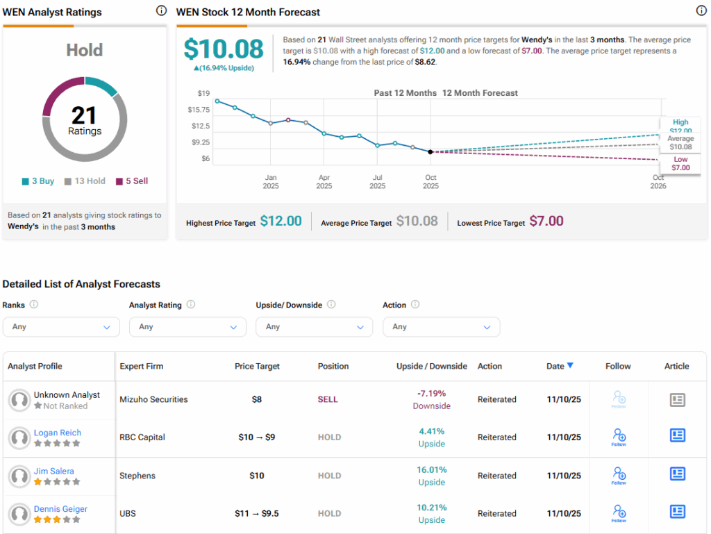 월가 증권가의 웬디스에 대한 컨센서스 투자의견은 보유다. 최근 3개월간 매수 3건, 보유 13건, 매도 5건의 의견이 나왔다. 평균 목표주가는 10.08달러로, 현재 주가 대비 16.84% 상승 여력이 있다. 이러한 투자의견과 목표주가는 오늘 실적 발표 이후 애널리스트들이 분석을 업데이트하면서 변경될 가능성이 있다.