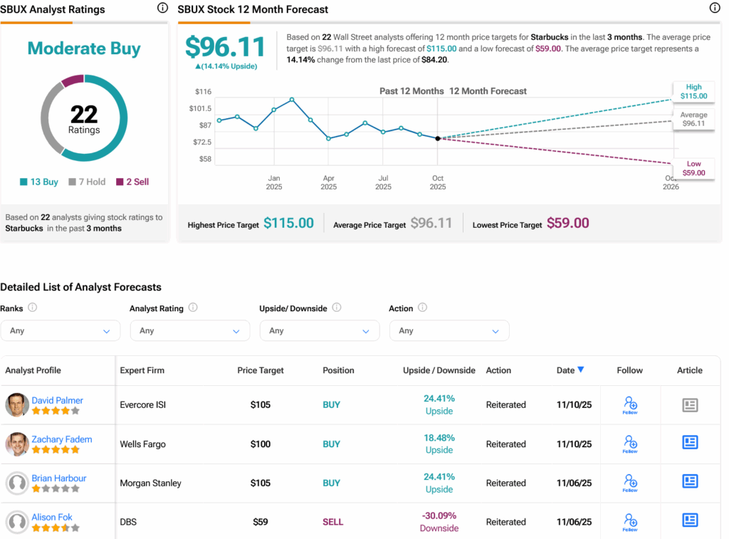 월가에서 증권가는 지난 3개월간 매수 13건, 보유 7건, 매도 2건을 기록하며 SBUX 주식에 대해 보통 매수 컨센서스 등급을 부여했다. 지난 1년간 주가가 14.69% 하락한 후, 주당 평균 SBUX 목표주가 96.11달러는 14.14%의 상승 여력을 시사한다.