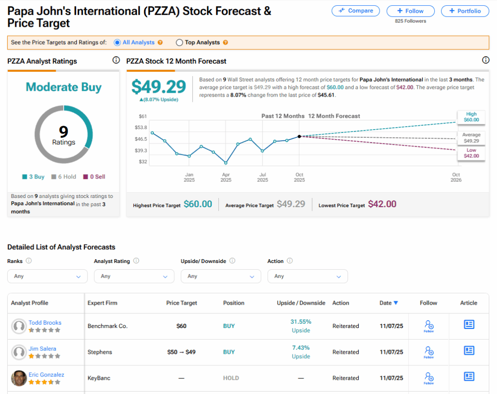파파존스 주식은 월가 애널리스트 9명 사이에서 보통 매수 의견을 받고 있다. 이 등급은 지난 3개월간 발표된 3건의 매수와 6건의 보유 추천에 기반한다. PZZA 평균 목표주가는 49.29달러로 현재 수준 대비 8.07% 상승 여력을 시사한다.