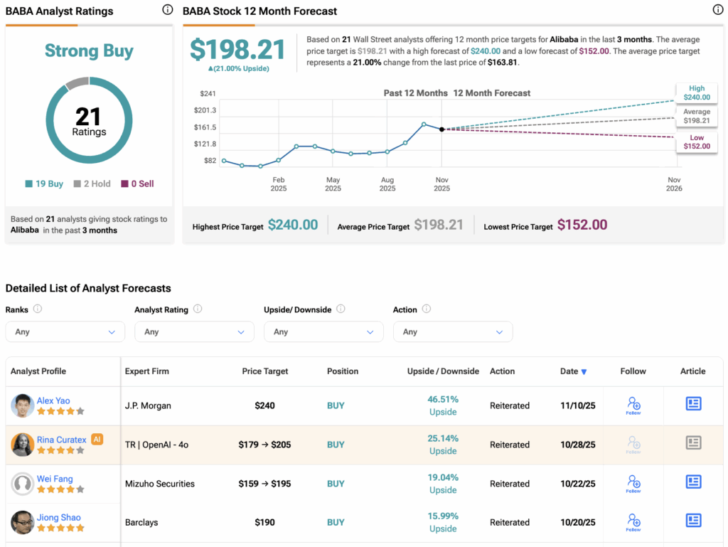 향후 전망을 보면 증권가는 BABA 주식에 대해 강력한 낙관론을 보이고 있다. 팁랭크스에서 이 주식은 애널리스트들로부터 19개의 매수와 2개의 보유 추천을 받았다. 한편 알리바바의 평균 목표주가는 198.21달러로 현재 수준 대비 21%의 상승 가능성을 시사한다.