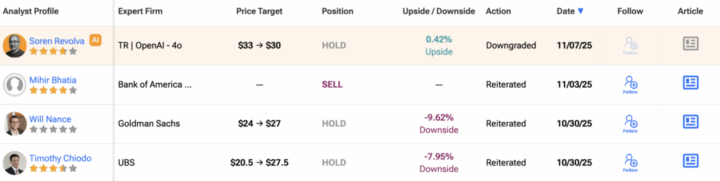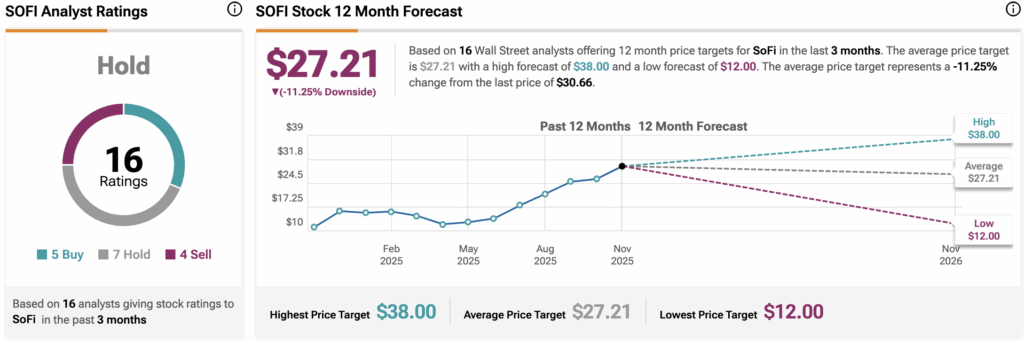 월가는 암호화폐 시장 복귀 이후 소파이 테크놀로지스(SOFI)에 대해 여전히 의견이 엇갈린다. 지난 3개월 동안 이 주식을 커버한 16명의 애널리스트 중 5명은 매수, 7명은 보유, 4명은 매도를 권고한다. 컨센서스 12개월 SOFI 목표주가는 27.21달러로, 최근 종가 대비 11.25% 하락 여력을 시사한다.