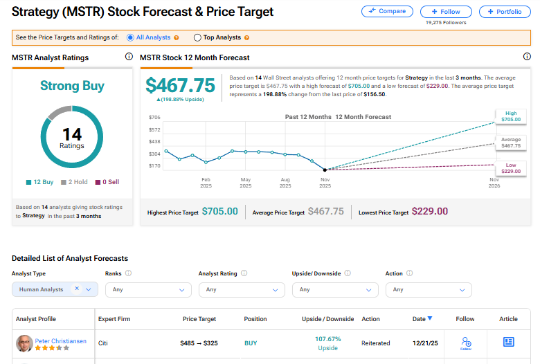 스트래티지 주식은 월가 증권가 14명으로부터 적극 매수 의견을 받고 있다. 이 등급은 최근 3개월간 발표된 12건의 매수와 2건의 보유 의견을 기반으로 한다. MSTR 평균 목표주가는 467.75달러로, 현재 수준 대비 198.88% 상승 여력을 시사한다.