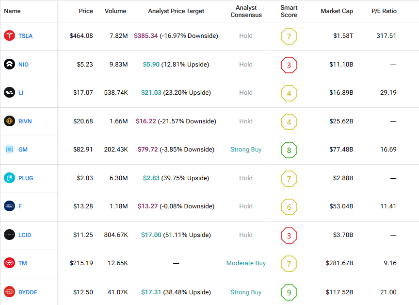 우리는 팁랭크스의 비교 도구를 사용해 이 기사에 등장하는 모든 기업을 정리했다. 각 주식과 전기차 산업 전체를 심층적으로 살펴볼 수 있는 훌륭한 방법이다.