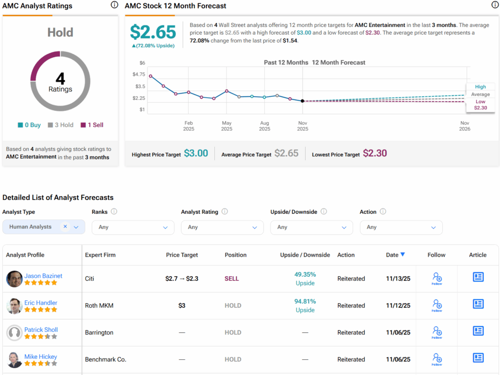 월가에서 애널리스트들은 지난 3개월간 3건의 보유와 1건의 매도 의견을 바탕으로 AMC 주식에 대해 보유 컨센서스 등급을 부여하고 있다. 또한 AMC의 평균 목표주가는 주당 2.65달러로 72.1%의 상승 여력을 시사한다.