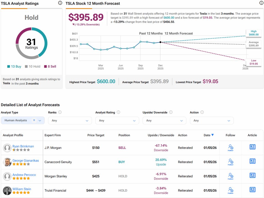 월가로 눈을 돌리면, 애널리스트들은 TSLA 주식에 대해 보유 의견 컨센서스 등급을 부여하고 있다. 지난 3개월간 매수 13건, 보유 10건, 매도 8건이 제시되었다. 아래 그래픽에서 확인할 수 있듯이 말이다. 또한 TSLA 평균 목표주가는 주당 395.89달러로, 13.3%의 하락 여력을 시사한다.