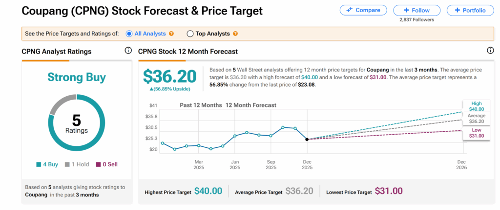 또한 CPNG의 평균 목표주가 36.20달러는 현재 거래 수준에서 약 57%의 상승 여력을 시사한다.