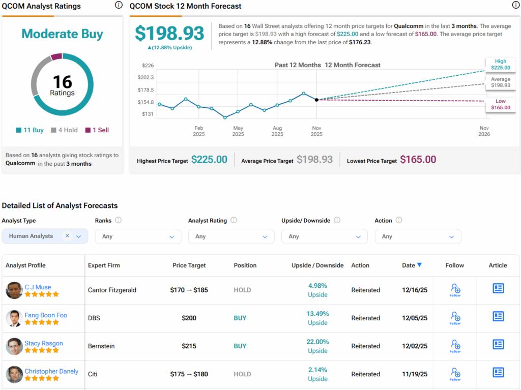 월가에서 애널리스트들은 지난 3개월간 매수 11건, 보유 4건, 매도 1건을 부여하며 QCOM 주식에 대해 보통 매수 컨센서스 등급을 제시하고 있다. 또한 QCOM의 평균 목표주가는 주당 198.93달러로 12.9%의 상승 여력을 시사한다.
