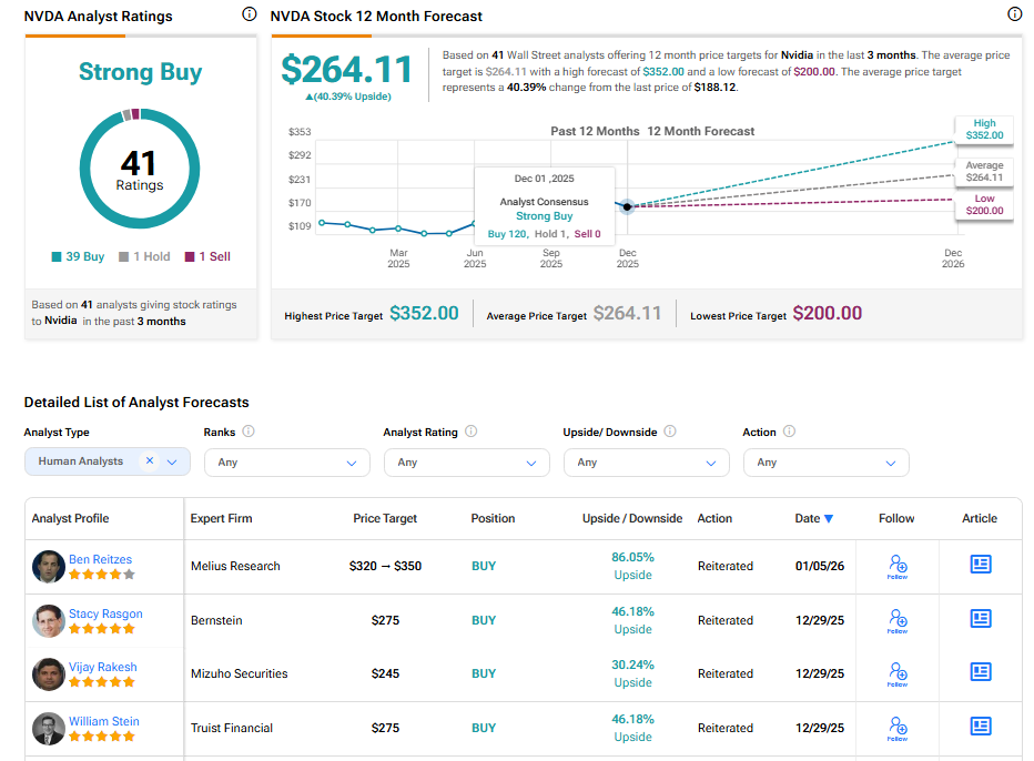 팁랭크스에 따르면 NVDA는 매수 39건, 보유 1건, 매도 1건을 기반으로 강력 매수 컨센서스 등급을 받고 있다. 264.11달러인 엔비디아의 평균 목표주가는 현재 수준에서 40% 상승 여력을 시사한다.